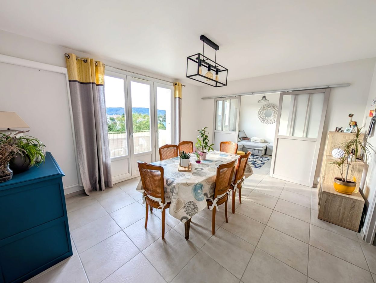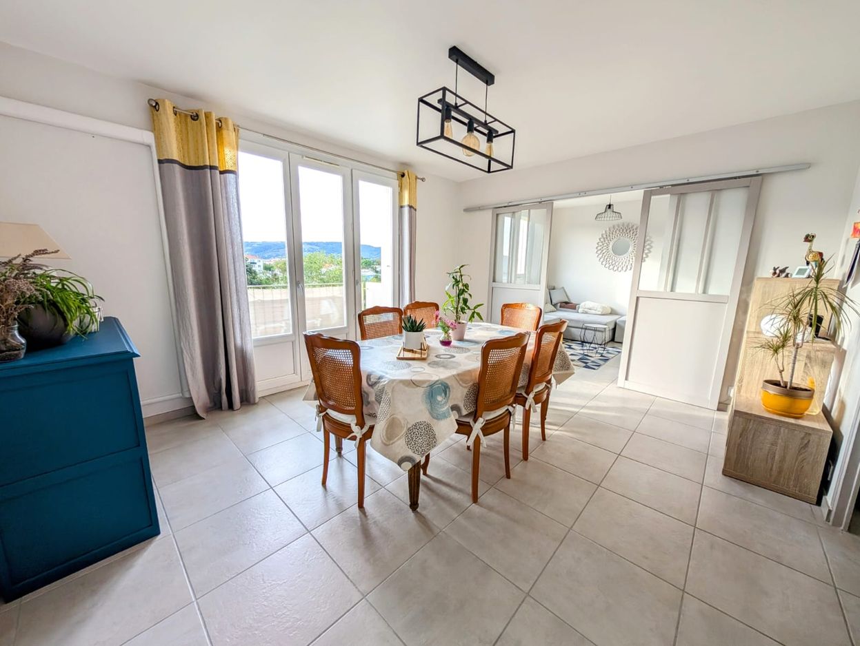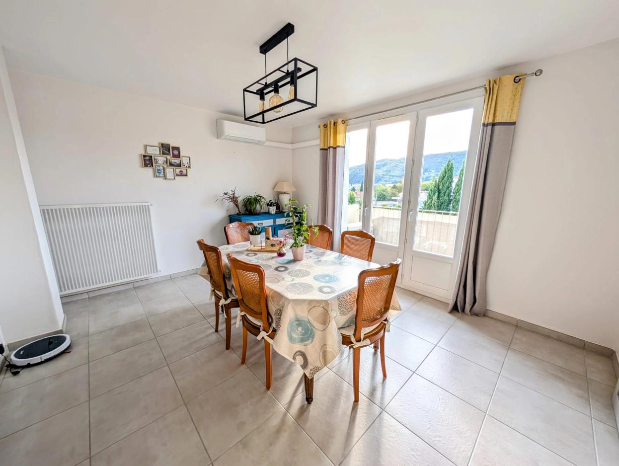 Happiness conseils vous propose à la vente cet appartement de 70 m² au sein d’une copropriété calme de Tain l’Hermitage. Copropriété calme et agréable à deux pas de toutes les commodités (transports en commun, supermarché, écoles, piscine, commerces de proximités…). Cet appartement situé au 4ème étage ne nécessite aucun travaux, il bénéficie d’une climatisation réversible et de volets roulants électriques. Côté jour, ce bien vous propose une belle pièce de vie lumineuse composée d’un séjour ouvert sur un espace salon. Ce séjour vous donnera également accès sur le balcon avec une vue panoramique sur les coteaux de Tain l’Hermitage. Vous trouverez également une cuisine récente équipée d’un four ainsi que d’une plaque de cuisson. Cerise sur le gâteau cette cuisine vous offre une très belle vue sur les montagnes du Vercors ainsi que sur les coteaux. Côté nuit vous découvrirez deux chambres avec placard de rangements ainsi que la salle de bain équipée d’un sèche serviette, meuble vasque et miroir. Un WC indépendant vient compléter ce bien. Vous apprécierez particulièrement les prestations de qualité que vous proposera ce bien : doubles vitrages, volets roulants électriques, climatisation réversible, cuisine moderne… Aucun travaux à prévoir dans l’appartement vous n’aurez plus qu’à poser vos valises et profiter de la magnifique vue sur les coteaux ! Ce bien est vendu avec une cave. Prix : 145 000 euros Possibilité d’acquérir un garage box dans la même copropriété en sus pour 12 000€